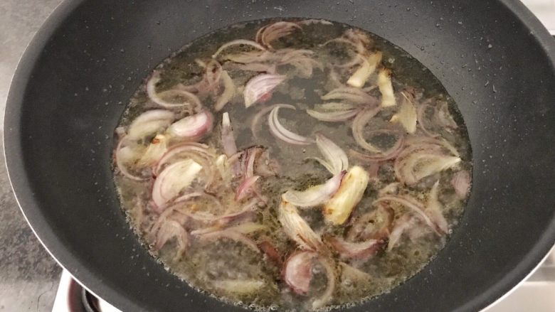 8. 油温5成热时,把洋葱加进来,煸炒出香味,