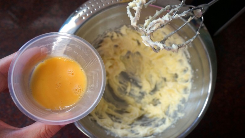 2. 分两次加入全蛋液,每一次都待搅打融合后再加入下一次。