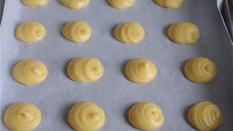 11. 挤好后的面糊,在烤之前喷上水。220度的温度先将 烤箱预热,泡芙胚放进去后立刻降低到200度烤15分钟,最 初用高温一次性加热使其膨胀,再降