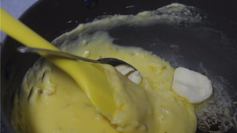 14. 用小火保温的牛奶再次加入至沸腾,加入蛋黄糊里,用手动打蛋器快速地搅拌,这里出现一点粘稠感最好,放凉
