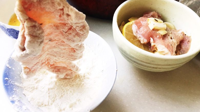 10. 处理大排。拎起来!放入面粉,泡个面粉浴。泡完了记得拎起来再抖动一下。让面粉均匀的裹在大排身上。