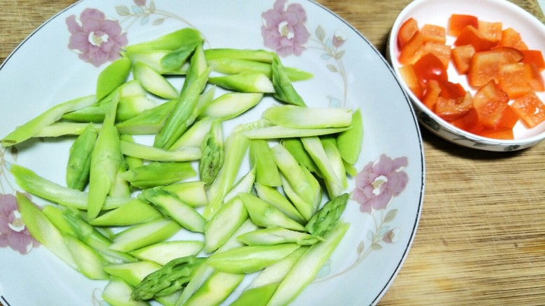 - 芦笋鲜嫩,不需要过度烹制,开水焯一下,再倒入锅内翻炒可以有效控制炒制的时间。否则炒久了影响口感。
