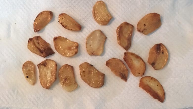 5. 原锅烧热后,加适量的油,小火将蒜片煎至金黄,