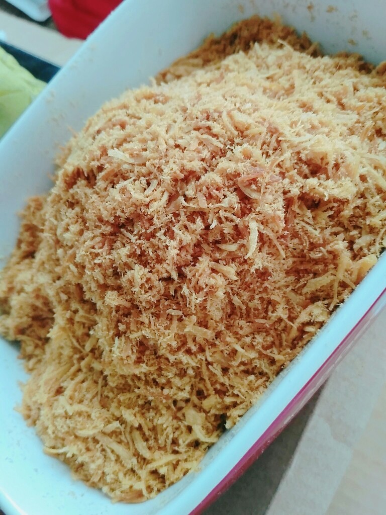 11. 洗净双手,把肉松用手搓几下,搓成肉丝起绒的样子。(手机拍照软件颜色显得有点黄)
