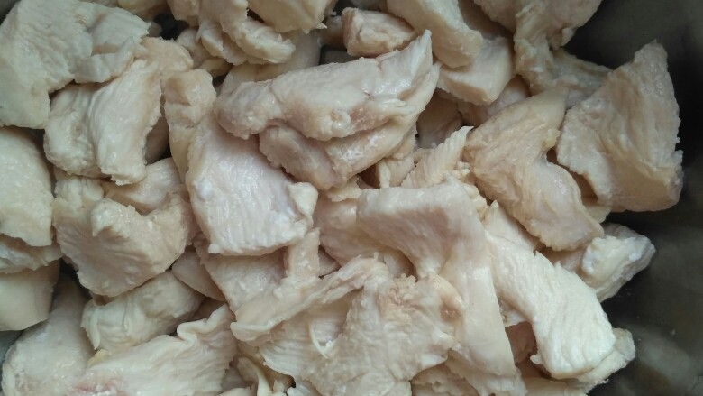 1. 剔除鸡脯肉表面的少量筋膜,洗干净切成小块,冷水下锅。