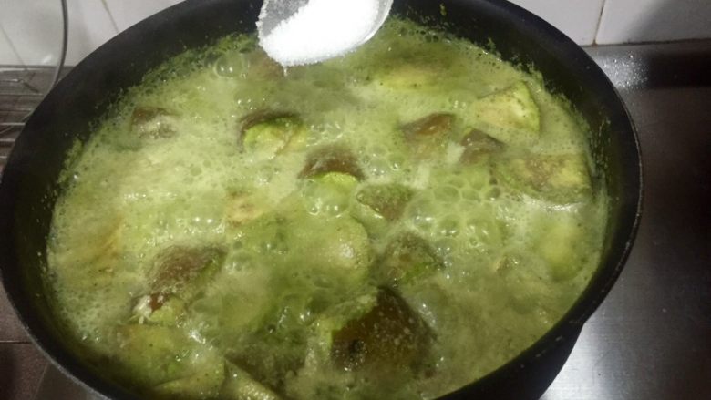 5. 等耶奶沸腾一会儿后,下青咖喱酱。六大汤匙,喜欢味道浓的可以根据自己口味加。