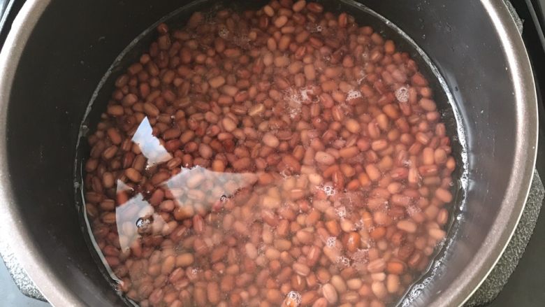 4. 倒进压力锅里,加水1300ml没过红豆大约2-3厘米即可