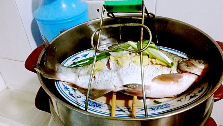10. 电蒸锅水开再用夹子夹鱼盘下锅蒸9分钟,焖三分钟