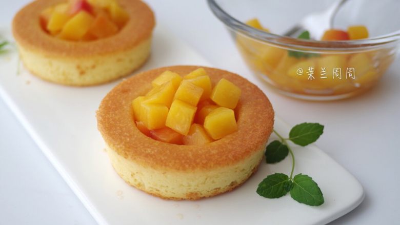 23. 23、在蛋糕中间凹进去的地方,放上之前煮好冷却的黄桃块。