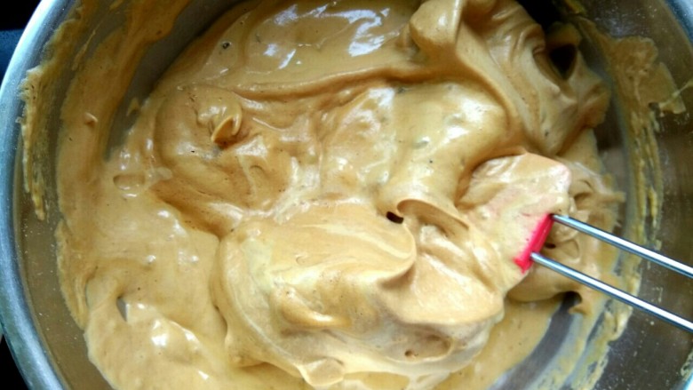 13. 把三分之一蛋白霜放入蛋黄糊中,用橡皮铲翻拌均匀