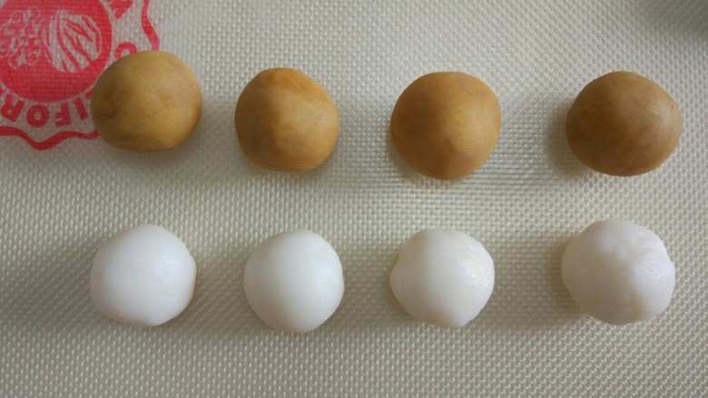 6. 剩下的白色冰皮分成每个20克,然后把馅分成每个25克,我用到的是郁香莱金沙奶黄馅,成品馅料直接可以用的。
