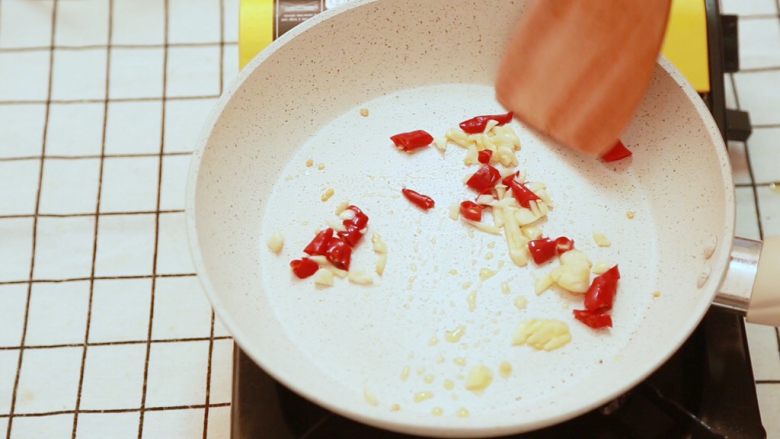 3. 处理配料,蒜切碎,红尖椒切圈~