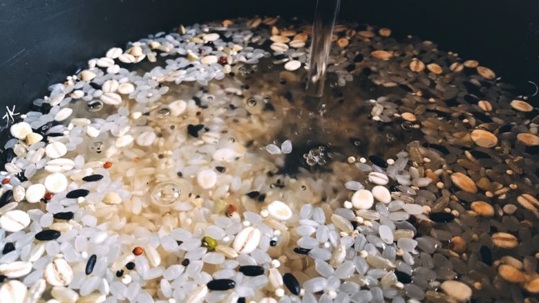 5. 在泡好的糙米中,倒入白米。 我除了白米之外,又混合了一些大麦仁和藜麦。
