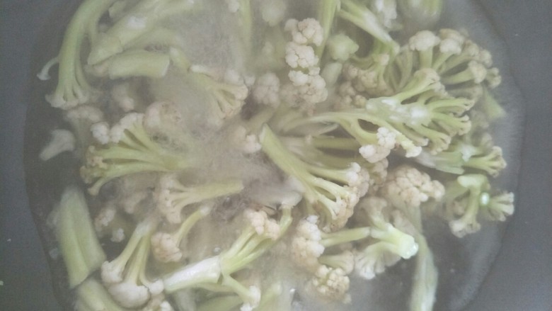4. 焯好水的花菜捞入凉水中,过凉水后沥干水备用