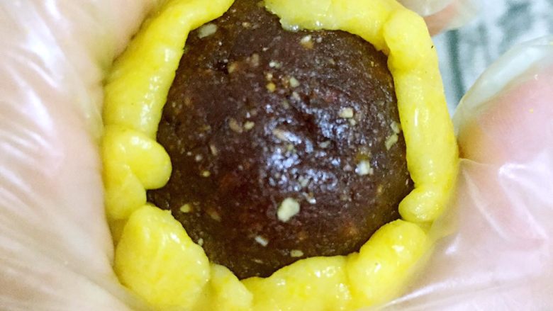 11. 将压扁的面团紧紧包裹住豆沙坚果球,最好做到均匀不露馅,方法基本同蛋黄酥制作方法一致,如果感到面团粘手,可以用少许玉米淀粉做手粉,就会很方便操作,注意是手粉不要粘太多,防止皮馅分离。