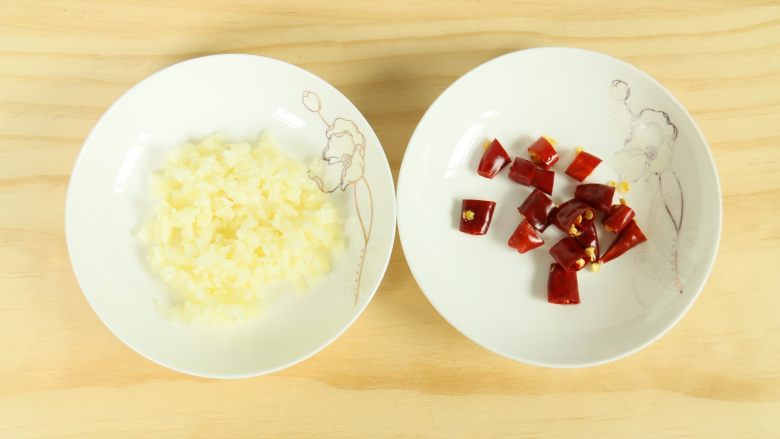 2. 大蒜去外衣,剁成蒜末,干辣椒洗干净后切碎。