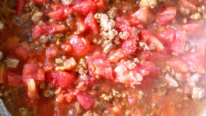 9. 把番茄碎放进锅里,和肉沫翻炒均匀