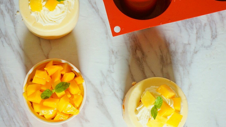 21. 再将混合好的慕斯糊倒入模具一半(我不小心倒太满)加入芒果再到至8分满放进蛋糕片冷冻4小时即可脱模