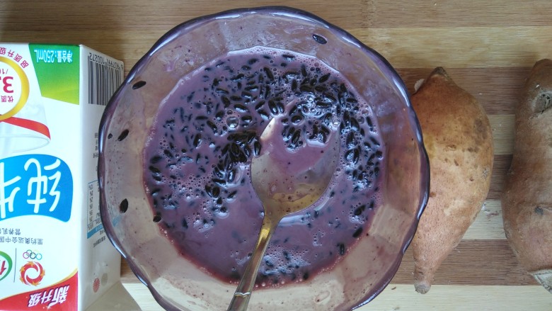 3. 蒸好的黑米可以拿勺子把米压成糊状 加入炼乳一起搅拌。