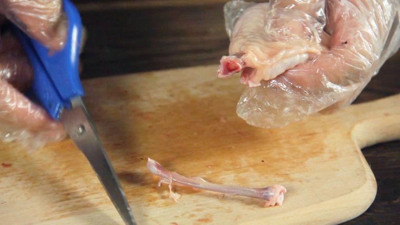 3. 中间两要小骨用同样的方法用剪刀慢慢分离,再慢慢转动拔出骨头,鸡翅的骨头就剔好了