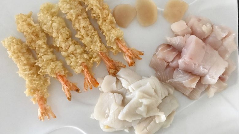 1. 准备海鲜(亲们你们也看到了,只有3个鲜贝,不是只需3个,而是樱桃家缺货啦😄。天婆罗虾可以换成新鲜虾,成品后菜式会更漂亮👍)