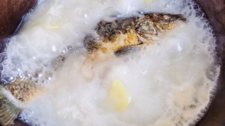 7. 开大火煮开后转小火炖煮,几分钟后鱼汤就能炖成奶白色。
