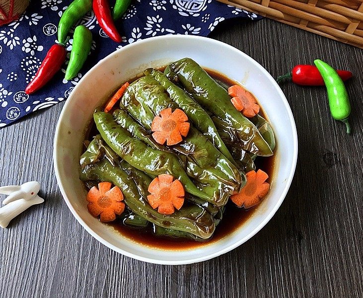 - 青椒6个、胡萝卜少许、食用油适量、料酒适量、香醋适量、白糖5小勺、食盐1/2小勺、鲜鸡汁少、红烧酱油少许、特级鲜酱油少许
