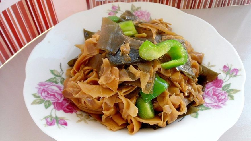 这种笋片是干笋,将其经过泡发洗净才可以烹制的。因为海带和笋片的色泽有点单调,所以就加了一个青椒搭配。泡发的笋片口感较硬,最好提前用压力锅煮一会再用。