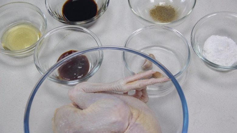 3. 将鸡头,翅尖,鸡爪切除,鸡身洗净备用