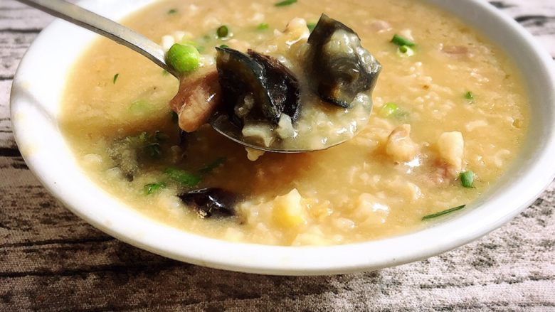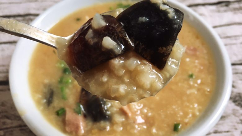 10. 放皮蛋瘦肉下去一起煲,如果是刚煮开的粥就可以直接放材料下去滚熟即可,我这锅粥是凉的!