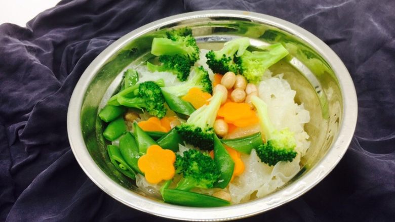 银耳的营养成分相当丰富,在银耳中含有蛋白质、脂肪和多种氨基酸、矿物质及肝糖。此外,银耳中还含有海藻糖、多缩戊糖、甘露糖醇等肝糖,营养价值很高,具有扶正强壮的作用,是一种高级滋养补品。常吃银耳可清热健胃,护肝解毒,通便,润肺养血,美容养颜。 这道菜咸鲜中带有微麻微辣,非常爽口,是养生利好菜品。