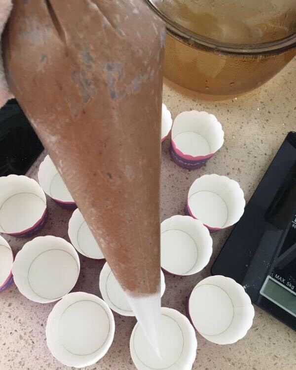7. 将蛋糕糊放入裱花袋,挤进纸杯。