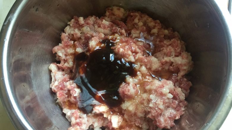 1. 买回现成的猪肉泥,加入料酒、生抽、老抽、蚝油、盐、砂糖、香油、鸡粉和葱姜水