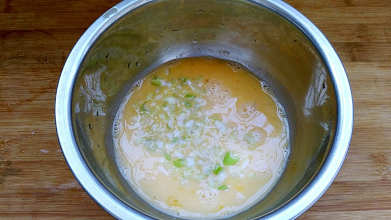 5. 鸡蛋打入盆里,用筷子搅拌均匀。