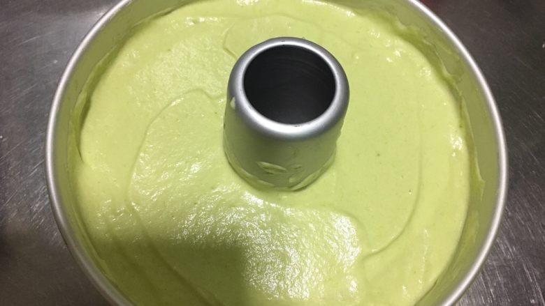 17. 倒入模具,表面用刮刀摸平,拿起模具在桌面上震几下,震出大气泡。然后马上放进预热好的烤箱里,中下层,45分钟。(各家烤箱不同,温度时间依照自家烤箱脾气来定哦,拿不准的可以配个烤箱温度计,正常戚风烤制温度是170度,我家的偏高10度。)