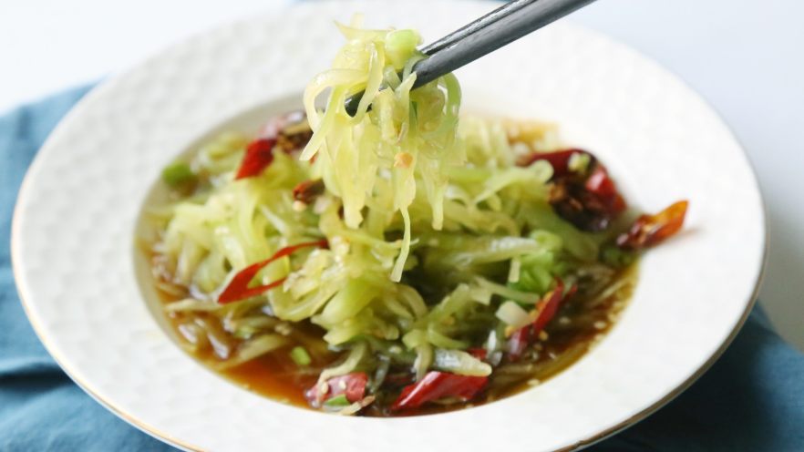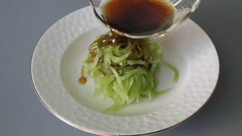 13. 挤干水分的莴笋放入盘子,淋上调好的汁。