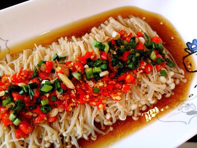 11. 五分钟后,金针菇蒸好,拿出来倒掉盘子里的水