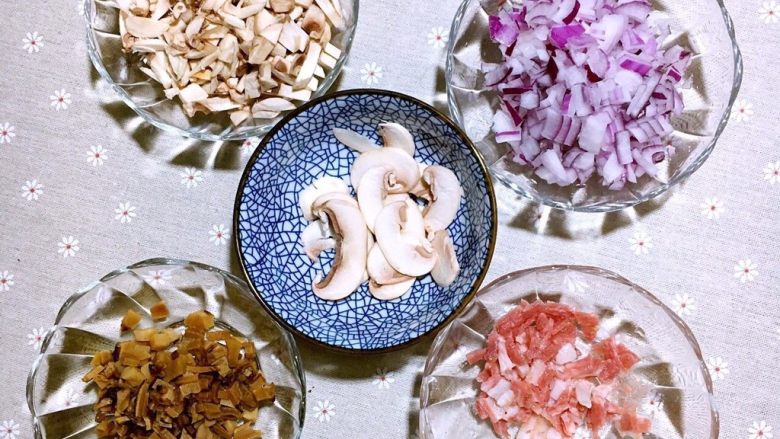 3. 切成片的口蘑暂时不炒 热锅,放入10g黄油,油热后依次放入洋葱,培根,口蘑,松茸翻炒出香味盛出待用。