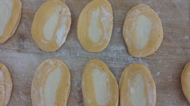 7. 把白的放到南瓜中间,包起来,把多余的切掉,再把面揉圆一点