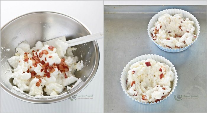 3. 筛入帕馬森芝士粉,轻微的拌匀。然后放入培根,再稍微翻拌即可。不要过度的搅拌,要不然蛋白泡沫会很快的消掉。