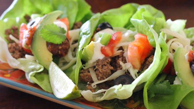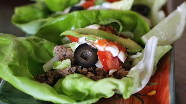 3. 生菜 洗干净并拍干水分,然后把叶子铺在盘子上。在每张菜叶上都放上一些牛肉末,以及你喜欢的配料。