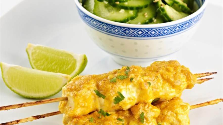 沙爹鸡肉串配芝麻黄瓜色拉,在料理机中,加入泰国柠檬叶 ,柠檬草 ,去籽的红辣椒,大蒜 ,顺滑型花生酱 ,姜黄粉 ,椰奶 ,黄糖 ,生姜,青柠汁和皮屑和泰国鱼露 。
