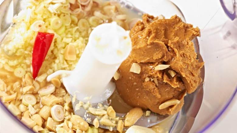 3. 在料理机中,加入泰国柠檬叶 ,柠檬草 ,去籽的红辣椒,大蒜 ,顺滑型花生酱 ,姜黄粉 ,椰奶 ,黄糖 ,生姜,青柠汁和皮屑和泰国鱼露 。