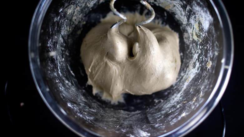 5. 中速搅拌,至面团有弹性且光滑,大约需要3-5分钟。面团摸上去黏黏的但是不会太湿。如果面团摸上去干,且很难成团的话,再加入一些香蕉泥。