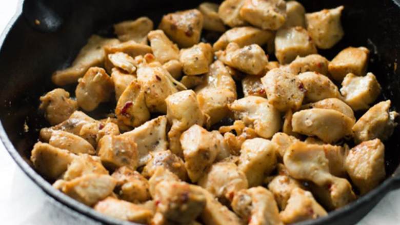 1. 把无骨鸡胸 (1/2 千克) 切成小片,撒上盐和黑胡椒 调味。取一只平底锅,中火加热橄榄油 ,放入大蒜 (剁碎)和鸡肉片,煸炒7-10分钟,直到鸡肉熟透。