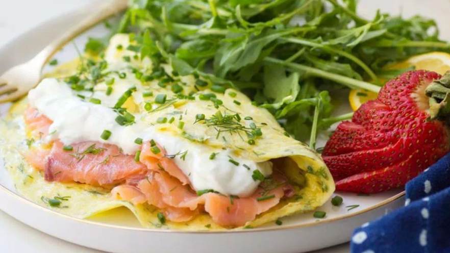 6. 蛋液基本凝固之后,在一半的蛋饼上加入烟熏三文鱼 和酸奶山羊芝士酱。