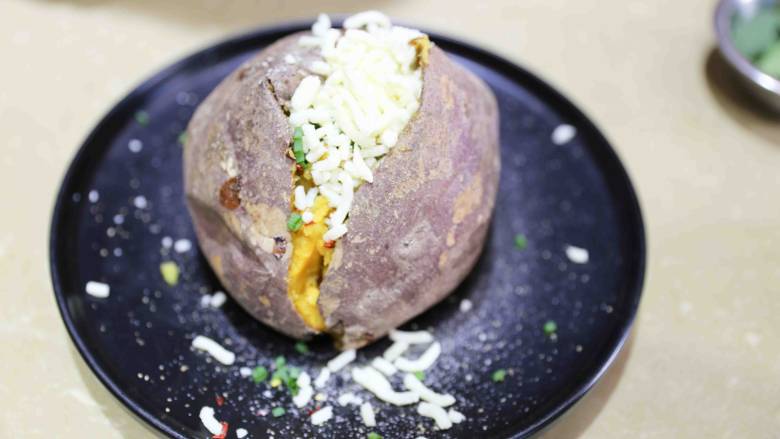 4. 取出烤好的大红薯 轻轻表面划开一刀,放入小葱 香菜,马自拉乳酪丝,辣椒面 ,咖哩粉海盐 及黑胡椒 用叉子轻轻拌匀