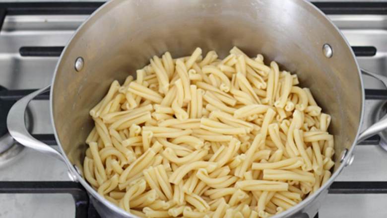 2. 大锅中放盐水烧开煮意面 ;煮的时间要比包装袋上的说明少3分钟,让意面保持稍生的状态。