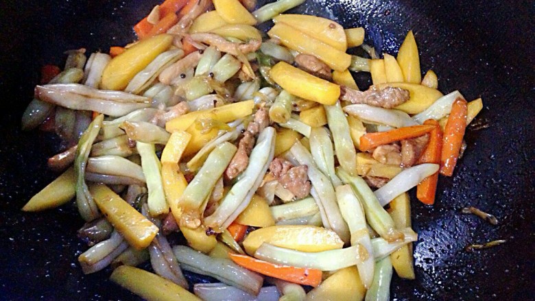 7. 开水炒干放,放味极鲜,土豆翻炒1分钟