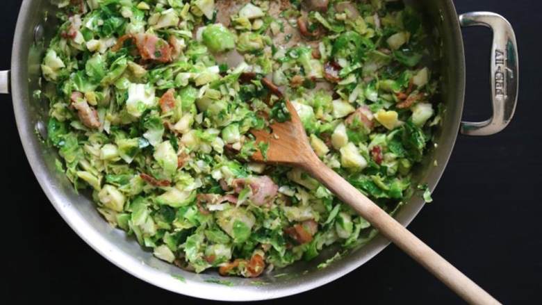 1. 预热烤箱至375华氏度或175摄氏度。将球芽甘蓝切成薄片,需3杯的分量。将培根 切丁。